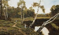 WOMEN IN LAKESIDE LANDSCAPE WITH BIRCH TREES , 1878