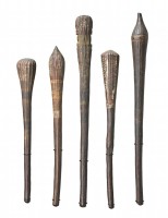A GROUP OF FIVE TIWI THROWING CLUBS