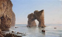 COASTAL SCENE WITH CLIFFS, ROWBOATS AND ARCHED ROCK, 1894