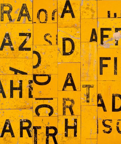 Like the best of her work, All That Glisters does not symbolise the landscape but rather 're-presents' it, each fragment of road sign evoking memories and associations particular to the individual viewer. With text thus skilfully transformed into texture, such works have not surprisingly been described as 'concrete, stammering poems'3- a perceptive analogy, especially giventhe artist's predilection for poetry. Notwithstanding, Gascoigne stresses that the flickering word fragments, though carefully arranged, are not intended to be read literally: 'Placement of letters is important, but it's not a matter of reading the text- it's a matter of getting a visually pleasing result.'4