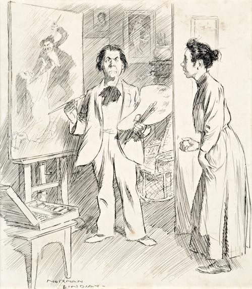signed lower left: NORMAN/ LINDSAY inscribed extensively by the artist verso
