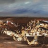 In Burke and Wills, Nolan shows the explorers naked to emphasize that they are defenseless against the environment. It is said that people in the agony of thirst take off their clothes. This is given a biting twist by partly immersing the two camels in water. The poignant fact is that the only water Burke and Wills experienced to this extent was in the mangrove swamps near the Gulf of Carpentaria, where the camels became knee deep in water. While other 'geographical' solutions may be sought, it is unlikely that Nolan had a specific place in mind, rather that he was portraying them as archetypal explorers- not just Burke and Wills, but all Australian inland explorers. Extended universally, they are a metaphor for the heroism of all who pit themselves against the vastness of Nature. Variations of this kind are not uncommon in Nolan's work, an important example being the 1966 painting, Camel and Figure in the collection of the Tate Gallery, London. Nolan introduced Lake Frome into the background of this painting, a lake that was not on the inland route taken by Burke. Interpretation of images aside, the two paintings share a wonderful fluidity of paint and mastery of colour.