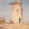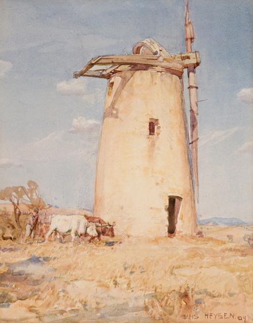 signed and dated lower right: HANS HEYSEN 09 inscribed verso: Dunn's Old Mill, Mt Barker/ Probably the first stone windmill built in this state for grinding flour/ By Hans Heysen/ Hahndorf/ Painted in 1909.