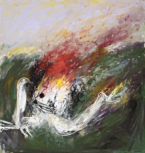 Given the artist's renowned social conscience, certainly it is not insignificant that his Nebuchadnezzar series was produced at the height of the Vietnam War when audiences internationally were assailed with images in the mass media of cruel dictatorial regimes: villages incinerated, men and women tortured, children screaming from the pain of napalm. As one author notes, 'self-immolations in protest actually took place on Hampstead Heath near Boyd's house... and once more, a biblical subject by him was seen to bean allegory of the descent of humanity in a conflicted world.'4 In Fallen Nebuchadnezzar on Fire, the protagonist is portrayed as a flaming meteorspiraling down towards a waterfall in the Australian bush - a doom presaged earlier by the symbolic felling of the tree in the king's dream. Although the sloping horizon line bears affinities with his compositions of the sixties (particularly the St Francis series), such opulent colour and light, rapid brushwork was hitherto unprecedented in Boyd's oeuvre- the white king here set against vibrant pinks and yellows of the fiery bush, with delicate nuances of gold and blue penetrating the sky.