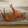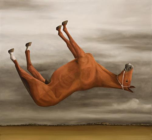 Continuing the artist's interest in the humorous transposition of animals in the landscape, the work directly references his artistic predecessor, Sidney Nolan, who himself was not unaccustomed to imbuing his art with an element of the absurd or bizarre. In particular, the present work bears strong allusions to Nolan's famous composition from his Kelly series, The Slip 1947 (National Gallery of Australia) where one of the police horses is portrayed suspended upside down in mid-air; as Nolan mused, 'I decided to put the horse upside down and give levitation another aspect... It is a dreadful descent and the horse will fall forever.'2 More generally perhaps, the work pays homage to the desiccated carcase paintings of Nolan's 'Desert and Drought series' which not only featured animals floating in undefinable spaces but, when first exhibited, were purposefully displayed as though floating away from the wall- suspended from a beam four metres high so as to evoke a sense of space and heighten the insubstantial, almost weightless quality of their subjects.