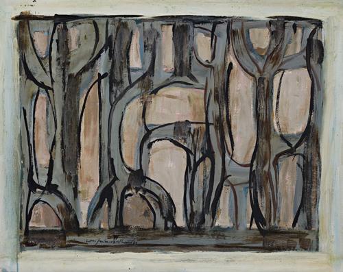 During 1959, at the age of sixty-nine, Ian Fairweather boldly turned to painting abstracts, describing his new work in gouache as 'sort of soliloquies- I suppose will have to come under the heading of abstracts.'1 In April of the following year he despatched a collection of sixteen paintings, mostly large, for exhibition at the Macquarie Galleries, Sydney in July. It is these works which Fairweather's biographer, Murray Bail, described as remaining 'among Australia's finest paintings- certainly the finest abstract painting- and fine enough to be shown without equation to the rest of the world.'2 Our painting is believed to be part of this group. Bail continued, writing how Fairweather 'consciously used abstraction to speak of experience beyond the experience of art itself. Painted in a winter of a long and difficult life the grey paintings arouse a subtle resonance, a contemplative serenity.'