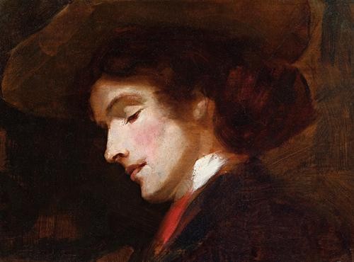 Our portrait is identified as Mrs Eileen Tooker on the basis of its similarity to the portrait 'Eileen' 1892 in the collection of the Art Gallery of New South Wales. (The Gallery purchased 'Eileen' in the year it was painted making it, together with Aboriginal Head- Charlie Turner c1892, the first works by Roberts to enter a public collection.) Both profile portraits of this striking Irish woman show the same strong facial features, prominent nose and chin, similar hairstyles and large hats. The beautifully fresh smaller work has all the immediacy of a study from life- pink flesh tones and red and white highlights against a darkly warm background. Roberts often enjoyed the profile, adopting it for a number of other portraits of the time, including the already mentioned The Paris Hat, At the Post Office 1892 and Portrait of a Lady 1892, whose features are not entirely unfamiliar. His male portraits for 1892 included Sir Henry Parkes (Art Gallery of South Australia) and Sir Charles Windeyer.
