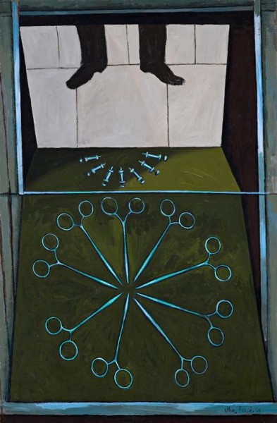 One of the more assured paintings of the series, The Rosette encapsulates well the paradox that ensues from the depiction of objects which may be associated with curing and healing but also, sickness and infirmity. Further irony exists in the distinctly decorative arrangement of the artery forceps in a rosette and small metal syringes in a semi-circle; as the artist himself observes '...you look in the window at all the instruments which are arranged... and it is obvious that somebody loves them, loves them dearly [and] has put them into these patterns, as if they were cosmetics, almost as if they hope that a passerby will be attracted by the display and say 'Ah, I must buy one of those pairs of artery forceps.'4