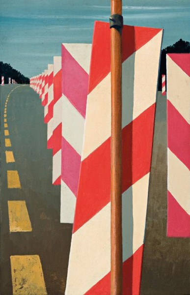 Like Cézanne, Smart's priority has always been the pursuit of the consummate composition - as articulated eloquently in his oft-quoted adage, 'the subject matter is only the hinge that opens the door, the hook upon which one hangs the coat.'1 Yet, unlike compositions that betray a sense of evolvement, Smart's paintings bear a remarkable quality of planned completion that is usually aided by a single dominant feature- in the present case, the beautifully rhythmic red and white road signs which lead the viewer to a dramatic horizon and mysteries of an unseen vista beyond. First appearing in The Red Arrow compositions of 1973, the use of the red and white chevron signs here demonstrates well the artist's manipulation of the formal qualities of his subject against literal demands: our knowledge of roads suggests the signs must be receding into the distance, yet in Smart's image, they merge to form a single harmonious surface, unified in colour and design. As Quartermaine muses, '...art and life, if not one, at least teasingly coincide; road signs will never be the same again.'2