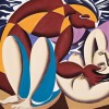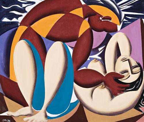 From 1937-38, Keyt's predilection for poetry and romance subjects flourished, with paintings of lovers occupying much of his production. Yet unlike elsewhere in his oeuvre, such works do not portray human lives but rather, the pursuits and affections of the gods of Hindu mythology- for example here the celestial Pritha, wife of the mighty monarch King Pandu, is raped by Surya, the God of the Sun. Subsequently, Pritha secretly became the mother of his son, Karna whom, in her maidenly shame, she concealed in a wicker basket and set adrift on the Gange River. Employing the distinctly cubist formula of the oval face with sharp profile simultaneously rendered, as well as the movement's structural rendering of curvilinear forms and general distortion of the human figure, indeed Surya and Pritha illustrates well the artist's strong stylistic affinities with his European contemporaries- namely Braque, Picasso and Leger. In spirit however, Keyt's aesthetic arguably bears greater resonance with the sensuous, reclining nudes of Henri Matisse which, in their warm intimate colour and elegant line, celebrate woman as majestic, poetic and lovingly tender.