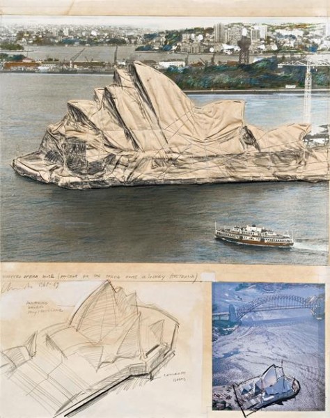 signed and inscribed centre left: WRAPPED OPERA HOUSE (PROJECT FOR THE OPERA HOUSE IN SYDNEY AUSTRALIA)/ Christo 1968-69