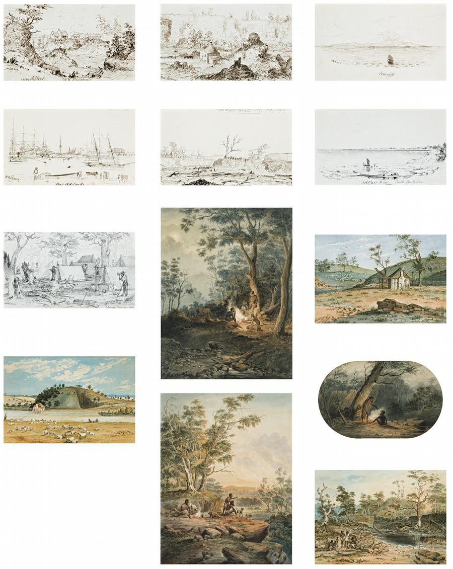 From North fleet in Kent, via Teneriffe to the Torrens River in Adelaide and on to the Echunga Diggings, this group of thirteen drawings and watercolours provides an absorbing and graphic record of early immigration and settlement in South Australia. In their precise, linear depiction, they are reminiscent of S. T. Gill's first drawings and watercolours of South Australia, capturing, as he did, views of Port Adelaide and pastoral life, and showing an absorbing interest in the Aboriginal peoples. By coincidence, both later went to Ballarat in Victoria. A gifted watercolourist, Thomas was born in Calcutta, India, son of Captain William Thomas of the 13th Light Infantry. Thomas' drawings and watercolours show that he had a keen eye for detail and a lively interest in his surroundings, as in North fleet, Kent where he presents himself sketching in the foreground. After his arrival in Adelaide aboard the Rajah in late 1848 or early 1849, he sketched the busy port scene with its numerous ships and boats. The River Torrens under a February summer sun followed, even more busily populated by the Adelaide tribe, dependant on the river for its food and water. (This was the same year as the arrival of that most interesting German artist Alexander Schramm (1814 - 1864), whose oil paintings of the Adelaide Aborigines number among his best.) Following his marriage to Maria Caroline Good in 1850, Thomas briefly leased the Northern Hotel on the Great North Road, worked in the Immigration Office at Port Adelaide, and wrote for the Adelaide Times. The same newspaper reported the exhibition of his watercolour of Nelson boarding the San Nicholas at Platt's Library. The work had previously been printed in aquatint in London in 1845.