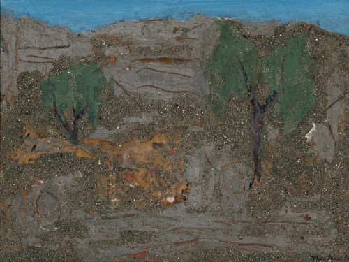 oil, enamel paint, synthetic resin and sand on composition board
