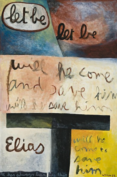 In Let be, Let be 1959, the initial 'let be' is enclosed, well-lit and in both the visual and verbal sense given emphasis over the second 'let be' which is shaded and has the illusion of being placed slightly further back in the picture. The main part of the text occupies the central area where part of the inscription seems to fade as the words 'will he' echo the opening of the text in a loss of confidence as they merge with the light supporting ground colour. Below this inscription the persistent image of the cross dominates the bottom portion of the painting: the symbol of the Crucifixion, dark and foreboding. Beneath the left arm of the cross, set in isolation, is written 'Elias', while under the other arm - as if balanced against the name Elias and all he represents - is inscribed 'will he come to save him'. This in turn is a variation of the statement found in the central portion of the painting, repeating it but in diminished lettering, as if hope is fading. The colour in this work is delicate, but while the harmonious qualities impart an aura of silence to the visual appeal of the work, it is applied in a supportive role to the words and not for any decorative quality it may possess.'3