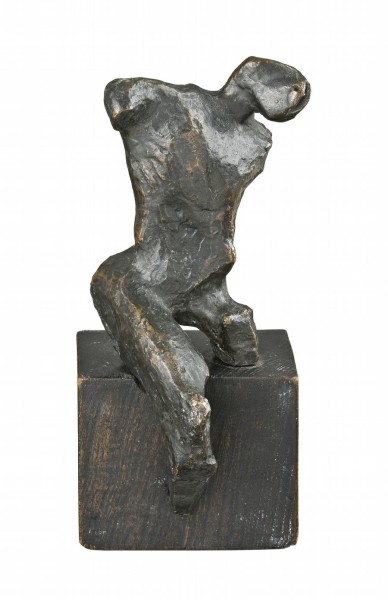 Moore wrote that the idea for The Warrior came to him in the early 1950s. 'It was evolved from a pebble I found on the seashore in the summer of 1952, and which reminded me of the stump of a leg, amputated at the hip. Just as Leonardo says somewhere in his notebooks that a painter can find a battle scene in the lichen marks on a wall, so this gave me the start of The Warrior idea.'1 Moore explored the concept through a wounded warrior image, then one with a shield, the figure, he wrote, 'though wounded, is still defiant' The head has a blunted and bulllike power but also a sort of dumb animal acceptance and forbearance of pain.' Of our bronze, he commented, 'The version without a shield is even more agonizing that that with the shield; the long right arm clutches senselessly in the void, whereas in the other version the shield supports the figure and the whole sculpture and gives it balance. The treatment of the surface is rough and cracked, as though to prevent a tautness and nobility of physique from diminishing the tragedy of this Patroclus figure.' Moore's experiences in the First and Second World Wars had a deep influence on these sculptures. In Maquette for Warrior Without Shield, the figure has been reduced to its basic elements with a characteristic blend of figurative and abstract elements. Moore found the meaning and power of life in the organic forms of nature, here present in the powerful bronze figure of this maquette.