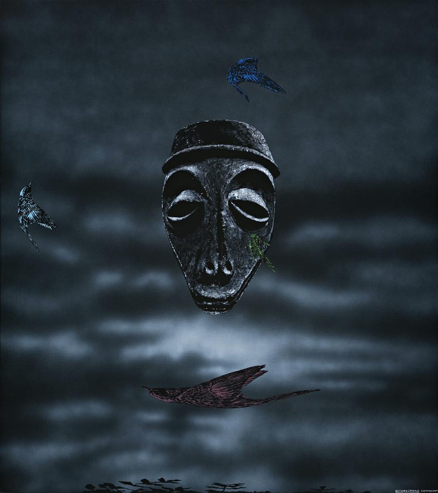 All perspective comes under question in this work as Cotton exploits the distance that representation establishes between objects, people and place. There is a surging glow from beneath the black clouds like that of a fluoro or LED light. Are they clouds, or are we looking up to the surface from underwater? The inclusion of an array of strategically placed birds suggest that the viewer is looking to the heavens. These birds are like multicoloured cut-outs, exotic and otherworldly. They appear to be circling and soaring on an invisible mobile, their fetters unseen.