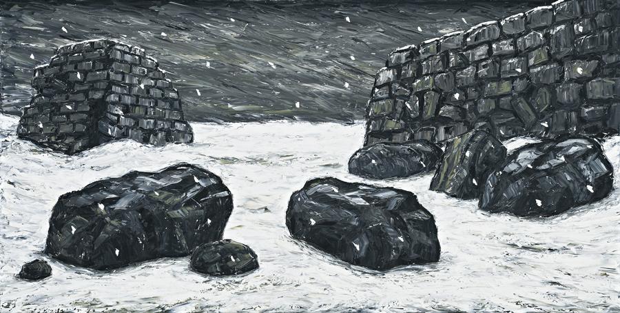 Like so many of Booth's epic snow-bound landscapes, Painting (Landscape with Stone Walls) 2002, presents almost as a stage set for the great heroic acts of history. Empty of figures, the snow paintings are overwhelmed by a profound atmosphere of silence. Populated only by the crumbled vestiges of rocky walls and buildings, our painting eludes both to past devastation but also importantly to the possibility of future renewal. As Jason Smith notes '...for Booth, the winter landscape is one of serenity and the promise of renewal. It reminds us of the resilience of nature and is a metaphor for human endurance against the physical and psychological trails of life...'1