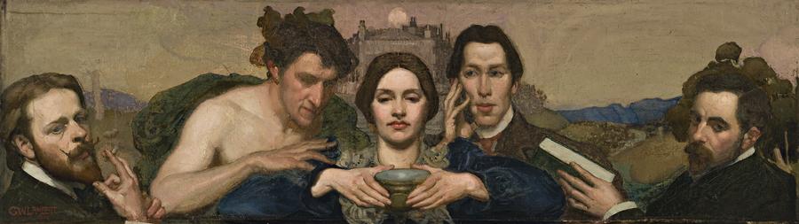 Identification aside, greater interest surrounds the subject of the painting. Anne Gray proffered the most reasonable suggestion that it is ‘a symbolic homage to the arts’.5 It could equally be an offering to the fates for good fortune. Lambert delighted in artifice; and in this and later allegorical works he indulged in the tantalising play of revelation and concealment, avoiding direct narrative and precise symbolism. The triumvirate of Lambert’s wife Amy and his artist friends Patterson and Ramsay – each an excellent portrait – provide the centre of attention. Patterson, Pan-like in classical garb and crowned with a laurel-like wreath, is absorbed by the cup of oblation offered by the stylishly beautiful Amy of full and sensuous lips. To the right, the handsome, lean-faced, Ramsay observes good humouredly, his image strikingly similar to Lambert’s 1901 portrait of him in the Art Gallery of New South Wales. Lambert, to the left, and the mystery man to the right look out to the viewer, inviting participation like saints in the paintings of the Old Masters which Lambert so much admired. The gigantic pile of rock and castle with its all-seeing eye of the moon are reminiscent of Arnold Böcklin and his several famous nineteenth century paintings of The Isle of the Dead, Lambert sharing with Böcklin the Symbolists’ love of mystery and exploration of what lies beyond that which is merely seen. The emotional undercurrent is redolent of the fin de siècle in its marriage of the sensuous and transient foreboding.