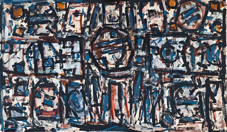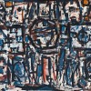 Roger Kemp's Sequence No 6 is a classic of its kind, masterly in its orchestration of powerful geometric forms and rich in characteristic colours. Its feeling of vigorous movement is ordered by a succession of shapes and lines, one following the other, as the title implies, both into and across the picture plane. This is given further momentum by the red-based pigments, which provide a special warmth to the cool, white field, across which marks of black and strokes of blues play in ceaseless motion. As in the best of Kemp's work, it touches on infinity through its creative and repetitive energy, the paradoxes of movement and stillness inviting contemplative meditation. It is, however, much more than a visual mantra, for in Kemp at his best we have the visionary, the artist-as-creator, his art an illumination and a revelation. As Christopher Heathcote wrote in his recent monograph on the artist, 'For Roger Kemp, art was inseparable from metaphysics.'1 Of the many manifestations of the creator in Kemp, one central theme is that of order emerging out of chaos. As in much of abstract art, there are also strong affinities with music, here more sonorous than lyrical. For Kemp there is the added influence of the Gothic Cathedral - the hieratic grandeur of its structure as a metaphor of the universe, and especially of stained glass with its black binding outlines of floating colour. The Kemps went on a grand tour of Europe in 1966. Although a spiritual or mystical feeling is apparent in his art from the beginning, Gothic references now increased. In 1968, for example, he titled a painting 'Gothic' and 'produced a sequence of cathedral-inspired drawings during 1967-8.'2 The outcome of this influence, however, is one of affinity rather than imitation in Kemp's development of his individual imagery and metaphors of communication.