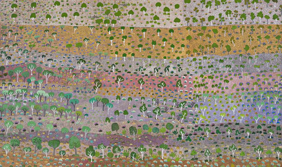 Reflecting a close relationship with the land, the painting references the changing colours of the region, reflecting changes in seasons and time of day. Bush medicine plants harmonise with sacred ghost gums. Bloodwood trees bearing 'sugar bag' are woven into the tapestry. Remnants of acacias, traditionally employed in the construction of shelters, are also depicted.