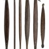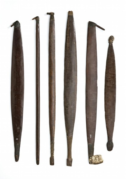 all six carved from hardwood, four of elongated leaf like form, most with pegs and resin handles, one with remnants of bi-valve handle