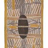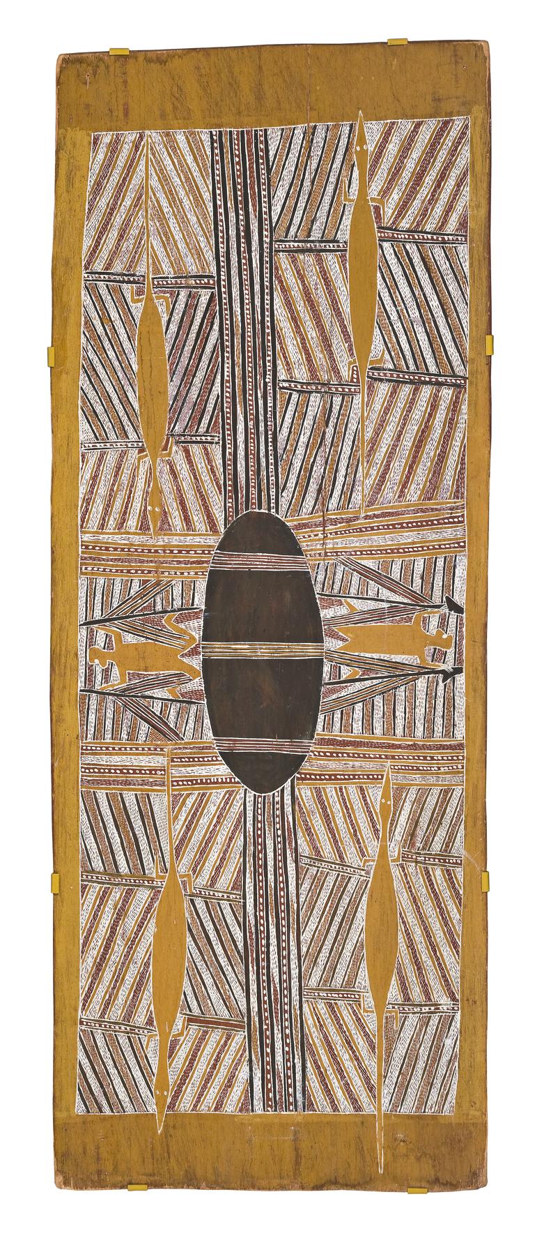 The descriptive label on the reverse reads: 'This is one of the dances performed in a sacred ceremony The Djungguan. The Wawilak (sic) Sisters wandered throughout Arnhem Land naming plants animals and fish reptiles and places killing many animals and fish. When they arrived at well of Mirrirmina (rock pythons back) they made a fire and threw the food on to it but immediately everything came to life and ran into the sacred well and thus became totemic emblems. Yurlungurr the giant python came out of the well and swallowed the Wawilak Sisters. In a desperate attempt to avoid themselves from being swallowed the sisters had sung and danced all the taboo songs and dances they could think of starting with the crab dance as the crab had been the first to jump from the fire and run sideways down to the well. Yurlungurr took the sisters back through the subterraneum waters beneath the well to their own country and regurgitated them onto dry land. They appeared in a dream to two Wongar men and told them that all the people must dance the same dances and sing the same songs as they had before being swallowed and these were to be performed at the time of the circumcision rites. Each sister had had a baby with her at the well and had intended to circumcise them but now they passed on instructions to the men to do this for them. Here two men representing the Wongar mythological figures dance with woomeras and spears around a sacred well. Goannas shown represent one of the totems of the artist handed down to him by his father.'