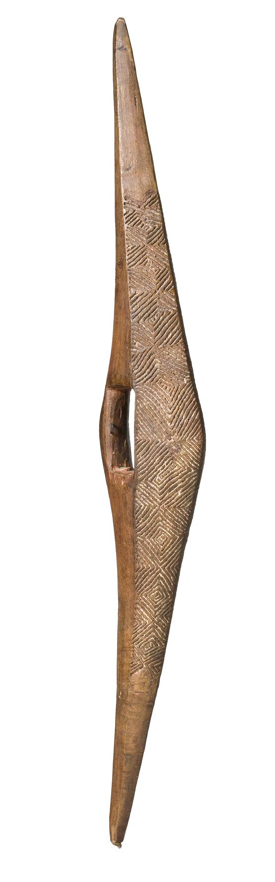 carved in hardwood, of tapering form, the triangular face decorated on both sides with engraved diamond pattern designs in eight sections with traces of old white and red pigment infill, with tapering ends and deep cut lug handle, bears old museum label with inscription 'Shield called Eelimun, Neela or Murriga', old patina overall