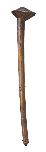 carved in hardwood, the striking section with fine adze markings, the shaft decorated with linear designs to the top section and roughly pecked designs at the handle, old shiny patina overall