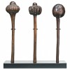 two with finely carved heads, one with bulbous rootstock head, all with incised pattern to hand grip, old patina