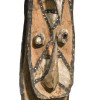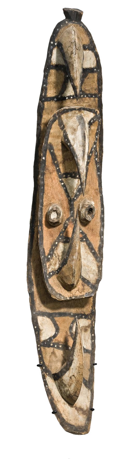 carved with opposing hooks, the centre with a stylised face, decorated with natural earth pigments