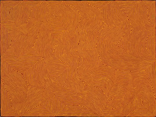 This painting relates to the claypan of Kirrimalunya, north of Wilkinkarra (Lake Mackay) and the events that occurred at this site in mythological times. This story is about two Ngangkari (Aboriginal Healers) who were camped at this site. They took something from their stomachs and wiped it on their arms. They were only boys but this healing power had been given to them by the time they were ten years old. This mythology forms part of the Tingari Creation Cycle.