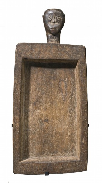 carved from hardwood, the deep cut bowl topped by an anthropomorphic head, shiny patina