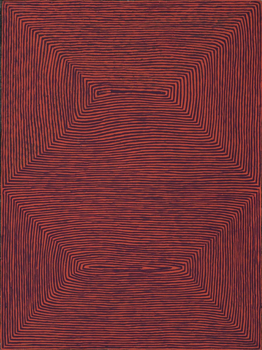 This work is accompanied by a certificate of authenticity from Papunya Tula Artists which reads in part: 'This painting depicts designs associated with the travels of a group of Tingari Women from the rockhole and soakage water site of Marrapinti, west of the Kiwirrkura Community. The women, of the Nakamarra, Nampitjinpa and Napangati kinship subsections, had been performing the dances associated with the area. They travelled east stopping at Ngaminya and the rockhole site of Wirrulnga, east of the Kiwirrkura Community, before continuing their travels... to Umari, east of Mt. Webb'.