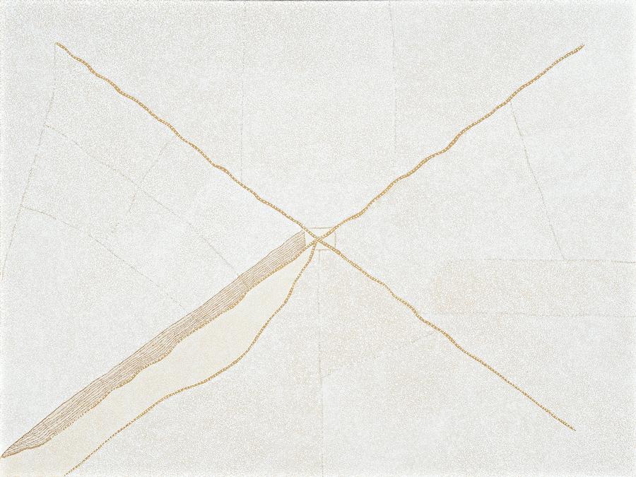 Representing a sacred women's Dreaming site, the centre of this painting is associated with the green pea (antweth) and the elongated X-shape represents two of the artist's Mountain Ancestors Dreaming paths. Throughout the painting are seeds (ntang) of the pea, which are an important food for the "traditional healer" (ngangkar), and the Mountain Devil Lizard (Arnkerrth).