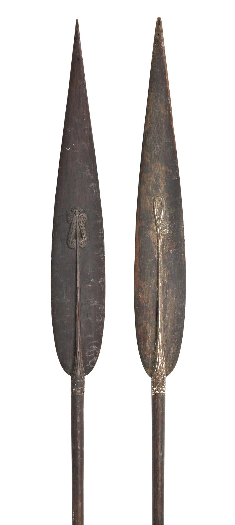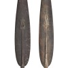 of elegant form, the leaf like paddle section with and simple curvilinear designs with traces of lime infill, the gently tapering shaft terminating in carved handle with engraved curvilinear designs, old patina