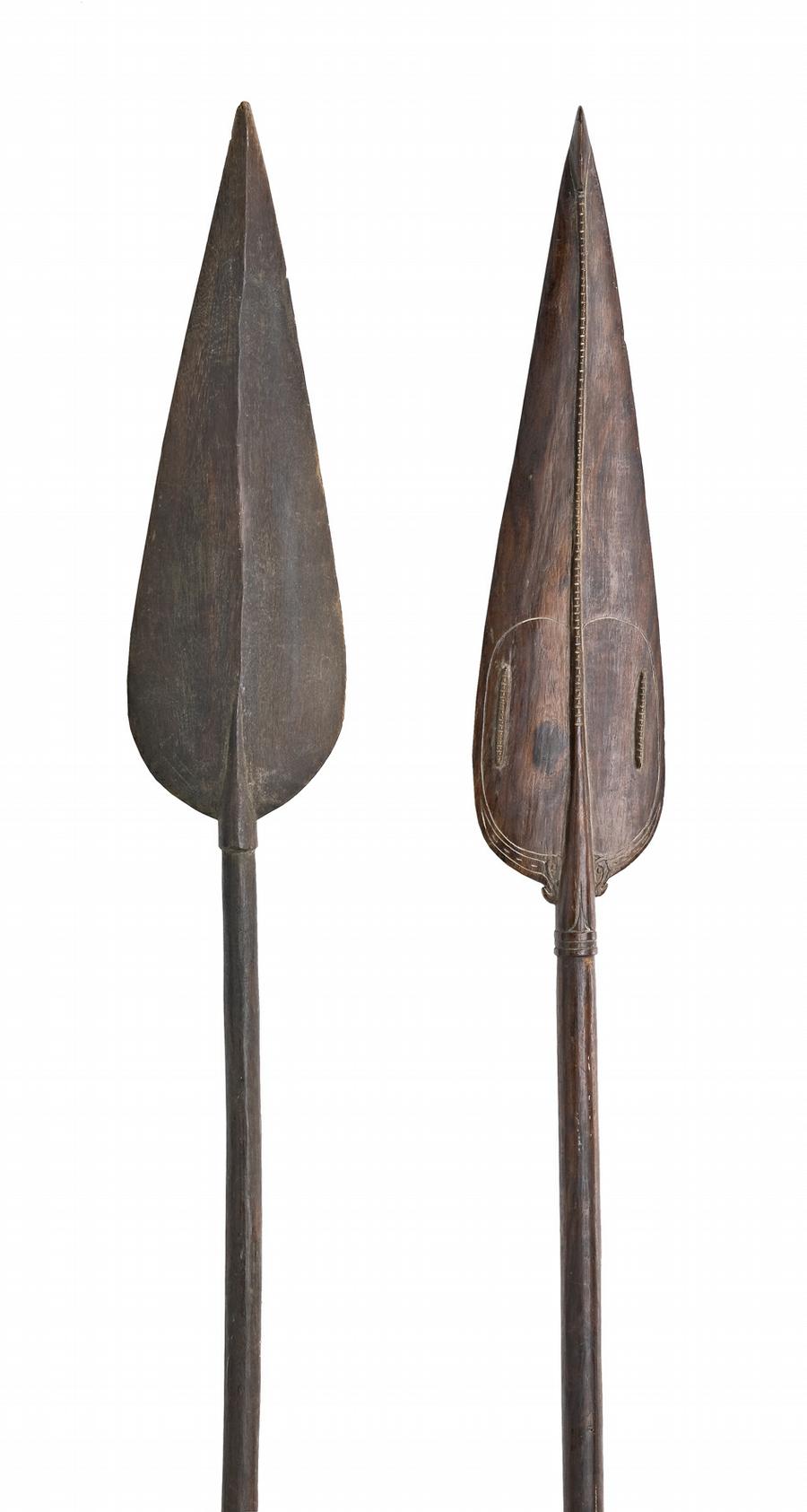 both of typical form, with elegant leaf like paddle section, one with fine raised longitudinal ridge terminating with a boss end and simple curvilinear designs, the other undecorated, old patina