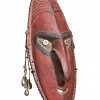 pierced in the back for attaching to a small hunting magic bag, pierced ears, septum and beard for decorative attachments, mother of pearl eyes, bush twine and cowrie shell ear adornments and painted in red trade paint