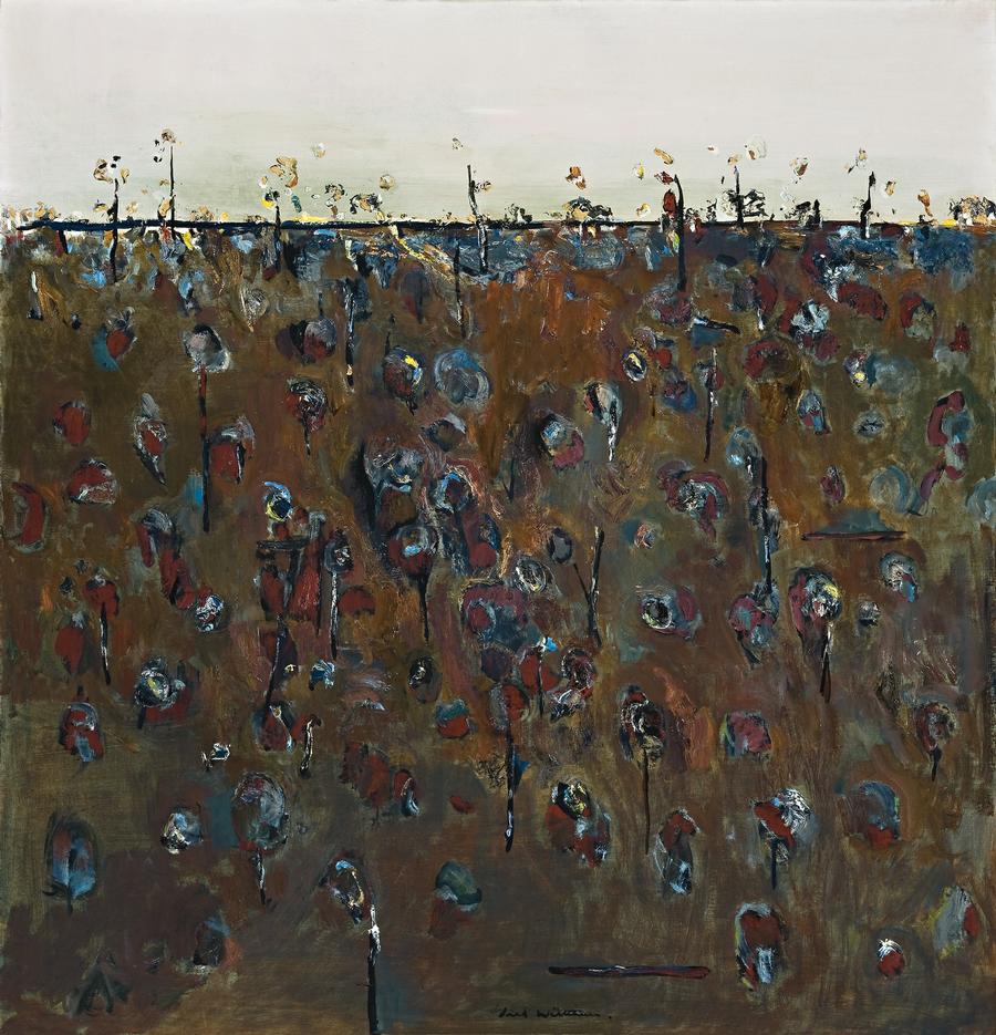 Among the several masterpieces in the Upwey series that Fred Williams painted in the mid-sixties, Evening Sky, Upwey is one of the best. Of these, Upwey Landscape I was formerly in the BP Collection, London, and II and V are in the collections of the National Gallery of Australia, Canberra, and the Art Gallery of Ballarat. Another, Landscape in Upwey II won the 1967 Georges Invitation Art Prize and Upwey Landscape V was awarded the 1966 Wynne Prize. If that were not enough, Upwey Landscape 1964-65 is in the Tate Gallery, London, and two further great paintings, Upwey Landscape III is in the National Gallery of Victoria, Melbourne, and IV in the Newcastle Region Art Gallery. When most of these works had their public debut at Rudy Komon's Sydney gallery in October 1966, they were received with critical acclaim. Wallace Thornton, art critic of The Sydney Morning Herald referred to Williams as 'a magnificent painter', and proposed that there was 'every chance he will go down in history as Australia's greatest landscape artist.'1 James Gleeson praised him as one of those 'rare landscapists who, like Drysdale and Nolan, have so imposed their personal visions upon a generation that we tend to see reality through their eyes.'2 The exhibition sold out; and when Williams' show opened at Georges Gallery, Melbourne the following year, the borrowed paintings carried the names of distinguished collectors of the likes of Rupert Murdoch and Mrs and Mrs Gordon Darling.