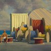 Livorno, bustling port city of Tuscany, lies on the west coast of Italy, not far from Pisa. It is within easy driving distance from Jeffrey Smart's home near Arezzo. Established by the Medici in the sixteenth century, it is nowadays Italy's second busiest container port. The detritus of such a place was a magnet for Smart's brush. It provided the still life of living, which so fascinates the artist. Although stated with the utmost clarity and realism, it is rich in ambiguity and surreal references. His is the art of the enigmatic and immaculate finish. Who is the man seated in white shorts? Why does he stare at us? Do the cables make some esoteric reference to modern means of communication? And so on. Smart's answer has invariably been that it is all to do with composition; the perfect balance of form and engaging colour. But why the darkening sky? And why do the birds rise in flight? - to return to other questions unanswered. One important answer - it is a beautifully abstract work of art in which the artist has presented all in geometric terms. There are circles, ellipses, ovals and rectangles. This reliance on the fundamental continues into the use of primary colours of red, blue and yellow. In First Study for' The Wharf, Livorno' you come about as close as you can to the artist's act of creation. And, with Smart, there is invariably a bit of tongue in cheek. The horizon neatly balances on the man's bald head. And what of the bald bollard nearby, as lively as the shadows, which, in silence, snake across the wharf? Paradoxes abound, including profundity couched in seeming simplicity. The painting is so exact. Its narrative, like Samuel Beckett, waiting for Godot. The play on absence extends even to the unpresent ship.