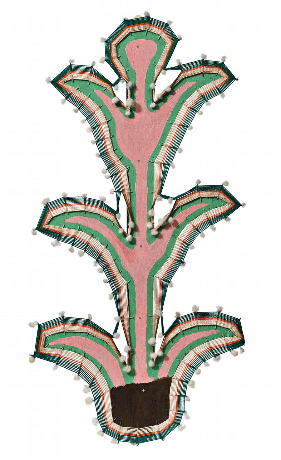 synthetic polymer paint, commercial dyed and natural wool on wood