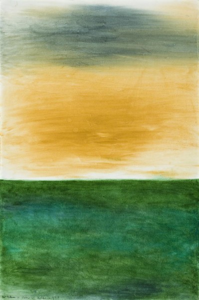 In a series of exuberant 'Turnersesque' watercolours and acrylics on paper, McCahon both acknowledged his surroundings and reflected his concerns over the environmental issues he felt threatened them. In striking contrast to the palette of black, white, sepia and shades of grey that characterise the three monumental paintings that pre-occupied McCahon in 1969-1970 (Practical Religion, Victory over Death and Gate III), throughout the various series that followed - View from the top of the cliff, Ahipara, Helensville, Muriwai and A Poem of Kaipara Flat - McCahon used colour to create mood and atmosphere.