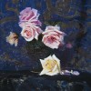 Arthur Streeton loved flowers, especially roses. This is seen and felt in the painting on offer in which the artist's response flows through his presentation of their beauty. A setting of deep blues was chosen to increase the visual richness of the painting, providing beguiling colour contrasts to the pink and yellow rose petals. Repeated in the seductive textures and continued in the decorative, branchlike swirls in the background, they echo and offset the roses' individual folds, created by the delicate interplay of light and shade. Streeton administered his coup de gràce with painterly bravura, his passionate response to the motif caught up in a moment of visual splendor.