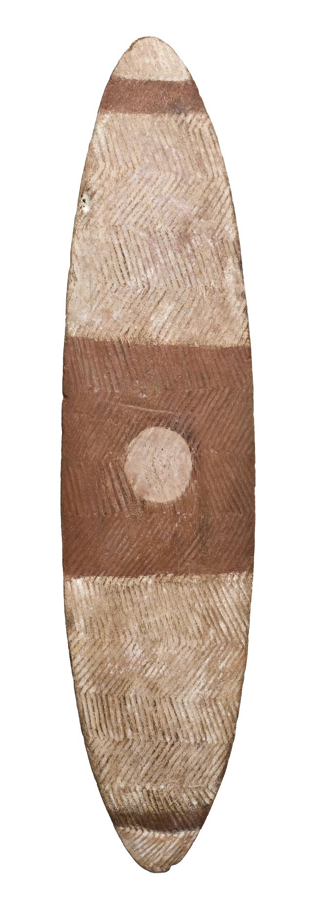 carved in softwood, of bi-convex section, the gently convex front incised with longitudinal zig-zag designs decorated with alternating bands of red and white natural pigments overall, the reverse with deep cut handle
