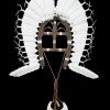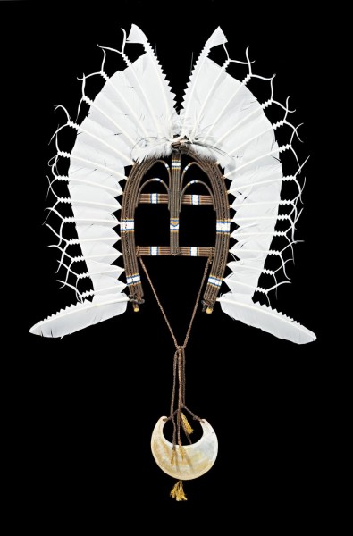 cane, bamboo, string with natural earth pigments, beeswax, shell, seeds, feathers and incised pearl shell pendant