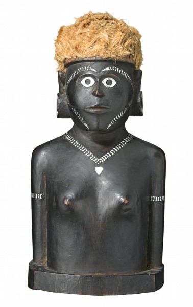 early 20th Century blackened hardwood with pearl shell inlay and attached coconut fibre coiffeur
