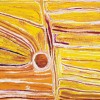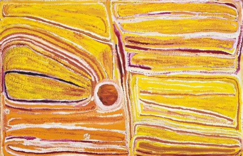 This painting, Kinyu, 2000 depicts Nampitjin’s traditional country found along the middle stretches of the Canning Stock Route, around Well 35 in the Great Sandy Desert, south west of Balgo. The tali (sanddunes) dominate this landscape, the centre of the work depicts the Kinyu waniri (rockhole), a site that is important for the dog Tjukurrpa (Dreaming).