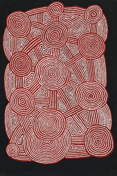 This painting is accompanied by a certificate of authenticity from Kayili Artists, Patjarr, Gibson Desert, which states in part: 'Lurrun is a rockhole north of Patjarr Community in the Gibson Desert. Tingarri men, women and children walk in separate groups but travelling in the same direction, stopped at this site'