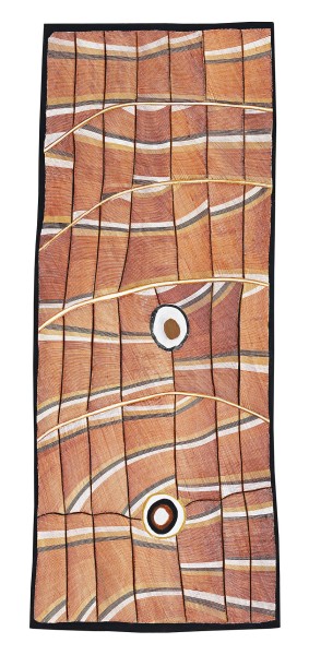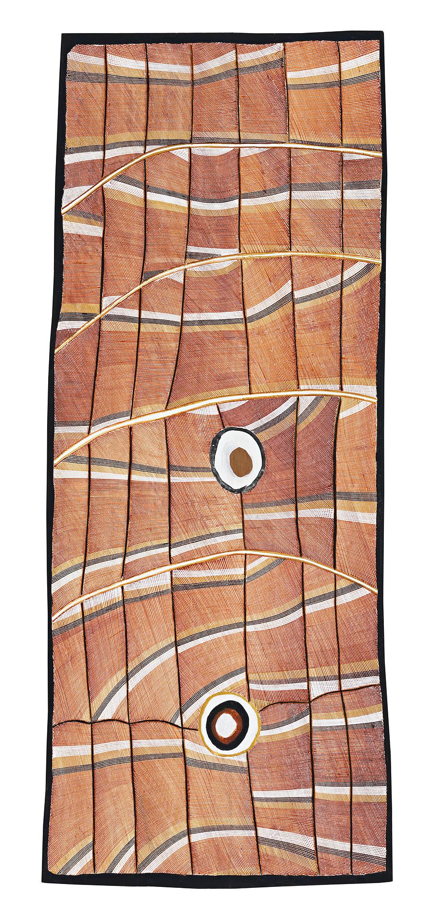 Born at Mumeka, located near the Mann River in Central Arnhem Land (an important site for the Kurulk clan), Mawurndjul’s early painting lessons were painting bodies for dance and initiation ceremonies. He had a very traditional upbringing, recalling his early involvement in ceremonial preparations as, ‘I saw my father doing the rarrk for the Mardayin ceremony and tried to do it myself with my back all double dover, I ended up being better than any of them at it. They gave me a job in the Mardayin ceremony to paint some rarrk. When they all saw me doing it they said ‘wow’, he’s got the hang of it. ‘you’ve left us behind my son’, they said to me.’1