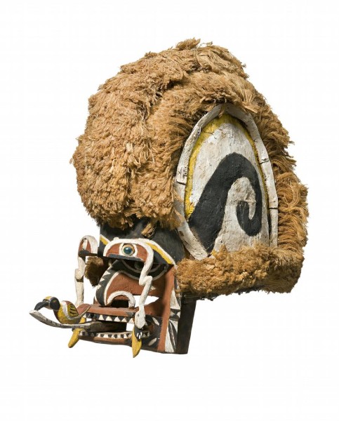 The tatanua mask, from New Ireland, is part of a rich sub-collection of objects related to the malangan funerary complex. The word tatanua derives from the word tanua meaning soul or spirit and tatanua dance masks are worn in malangan ceremonies to honour the dead. The masks are distinguished by their carved softwood openwork frame with protruding facial parts. The upper section characterised by a crest made of vegetable fibres and paperbark bound on a split rattan framework that is decorated on each side with natural pigments and lime applied to the exterior. These masks quite accurately represent earlier hairstyles worn by men during ceremonies. Until his death in 1995, Hosea Linge of Libba Village, the creator of this work, was recognised as one of the finest malangan carvers in New Ireland.