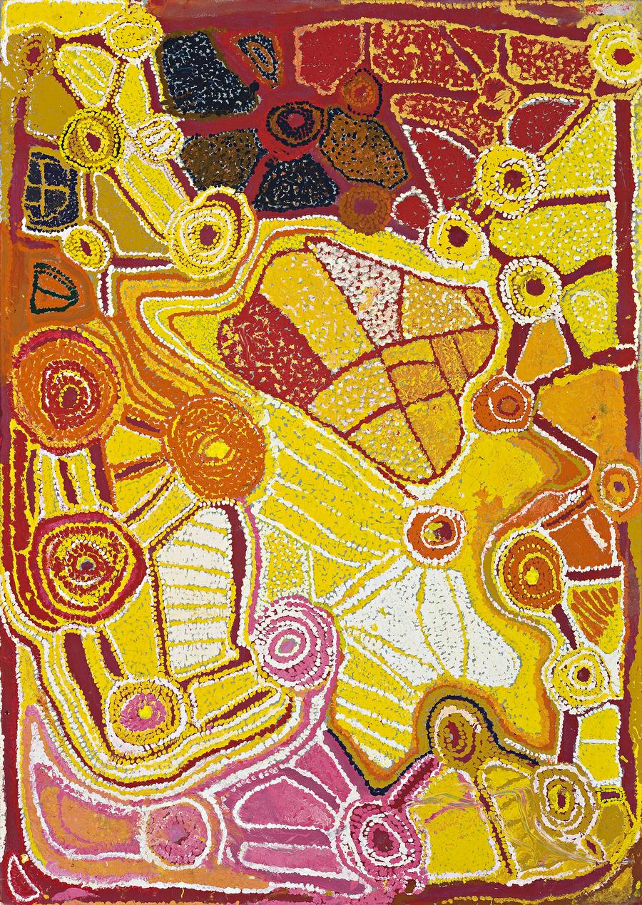 This fine work by Eubena Nampitjina was executed in 1993 at a time when she had resumed painting after an extended break. In many ways a transitional work; its high key palette of reds, oranges and yellows, with a lyrical and unusual incursion of pink, foreshadows much of what was to come. At over 80 years old Eubena is the matriarch of the Balgo community, a powerful law woman engaging in traditional activities whose paintings have attracted a considerable international following amongst collectors and major public institutions.
